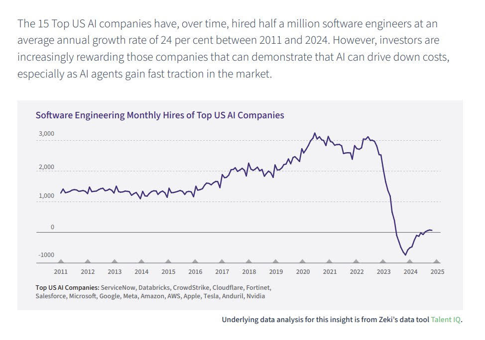 Software development hiring has significantly lagged general hiring in the post-COVID era, with many CEOs arguing that coding copilots (enter Windsurf’s $3B acquisition by OpenAI) can do the job of most entry-level engineers.